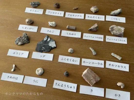 古代サメの歯の化石、ウニの化石、恐竜の骨やウンチの化石まで、様々な時代の化石が20種類入っています。モンテッソーリ小学校で使う生命の年表(タイムライン)と一緒にも使えます。タイムラインに描かれている三葉虫やシダ類、恐竜、アンモナイトなどの生物と化石を合わせていくのも楽しいお仕事です。2セットご購入頂くと、ペアリングのお仕事もできます。