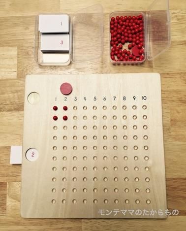 木製かけ算板の他に、100個の赤い木製ビーズ、1〜10までの数字が印刷された10枚のカードがプラスティックの箱に入っています。